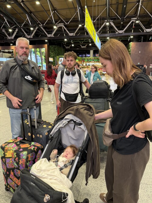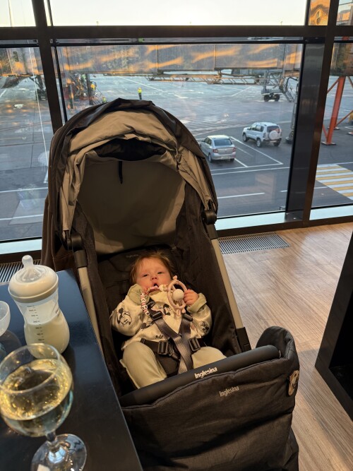 Наша малышка стойко выдержала первый день путешествия! Перед вылетом основное время провели в бизнес-зале, в самолет вошли последними. И спокойно без суеты разместились на местах, на 4 взрослых нам досталось 6 мест!