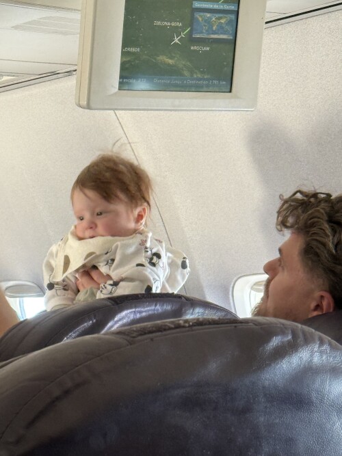 Ребенок спала, ела, тусила, играла, улыбалась окружающим пассажирам, и даже успела познакомиться и пообщаться со своим пятимесячным ровесником с соседнего ряда!