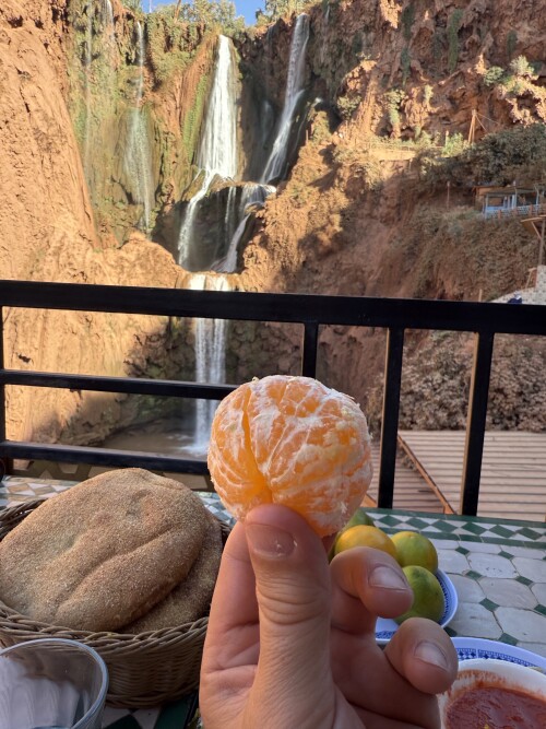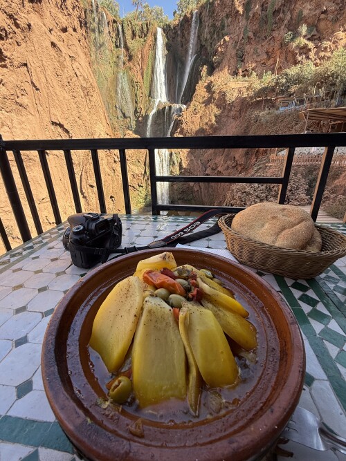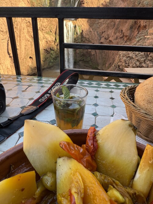 Restaurant Les Cascades, название здесь снова говорит само за себя! Мы с Лешкой зарулили в это место уже ближе к вечеру после насыщенной прогулки и очень удачно попали, когда всех автобусных пакетников уже практически закончили кормить. Меню в ресторане комплексное, состоит из основного блюда, салата, небольших закусочек и намазок с хлебом, и тарелки мандаринов на десерт. Точно не помню, но кажется напитки (в данном случае заказывали апельсиновый фреш и чай) идут отдельно. Тажин мне притащили просто невероятнейших размеров, и при условии довольно отуристиченного и я бы сказала в самом прямом смысле проходного места, все очень вкусно и довольно недорого! Вкуснейшие мандарины (таких больше не удалось попробовать нигде) были привезены в качестве вкусняшек деткам!