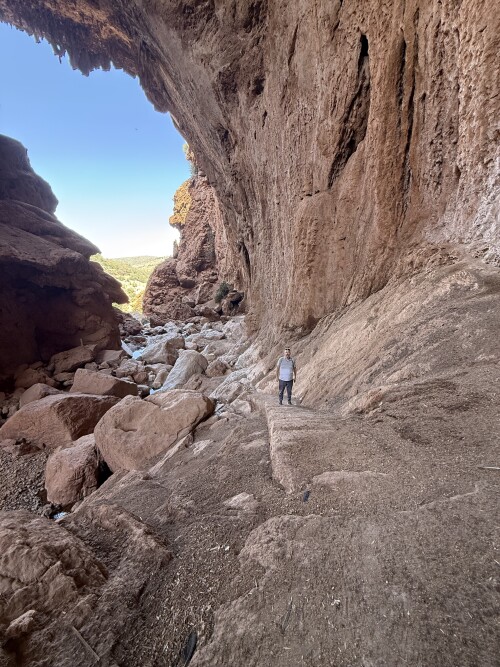 По ней мы, собственно, и сумели, аки горные козы, (местами приходилось буквально карабкаться и держаться руками за отвесную скалистую стену) перебраться через большую группу валунов, и оказаться прямо в самом сердце каньона, под мостом!
