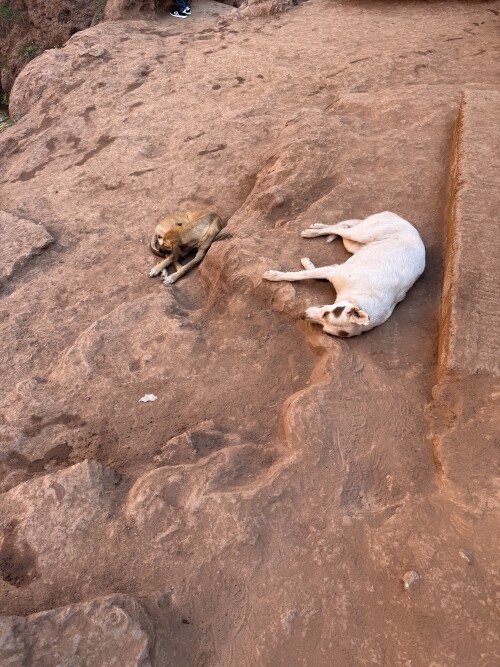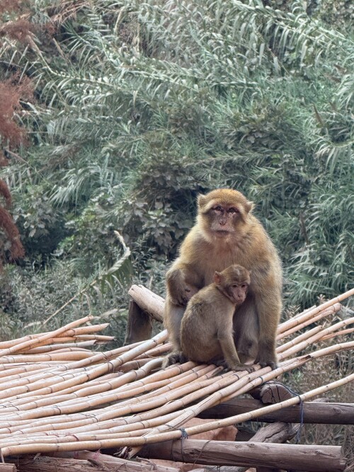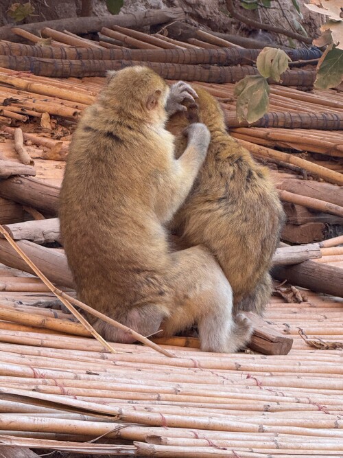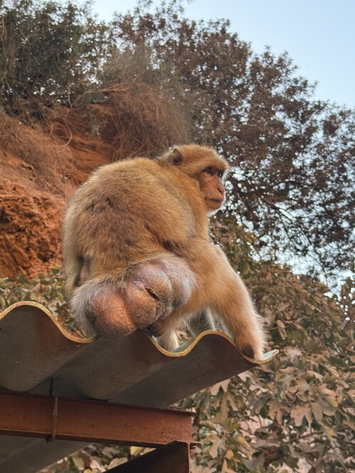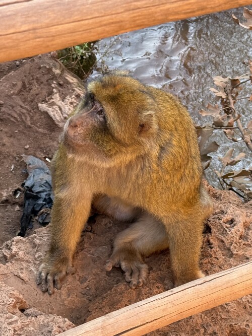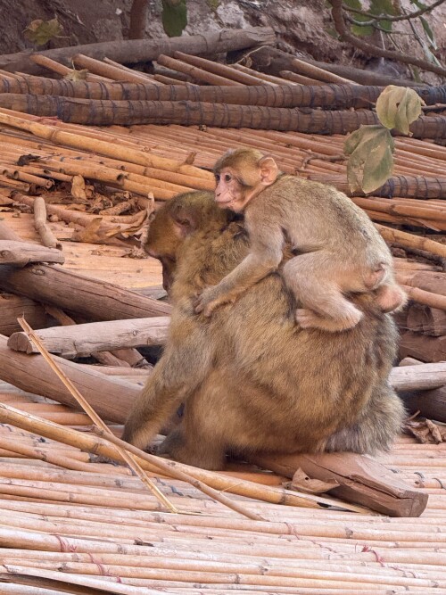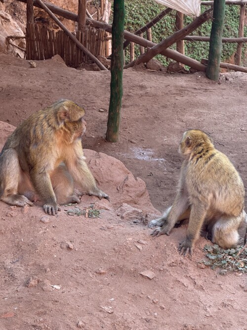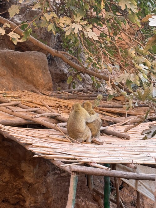 Природная красота, ее мощь и сила тут удачно сочетаются с рукотворной обустроенностью, здесь целая экосистема, оазис посреди выжженных солнцем красных скал и ко всему этому один милейший бонус в виде обезьянок, живущих в этих местах, совсем не боящихся туристов. Это бесхвостые маготы, которых еще называют берберскими макаками. С ними мы уже имели удовольствие встречаться, было это на Гибралтаре, но там обезьянки не слишком доброжелательны к туристам, в отличие от здешних.